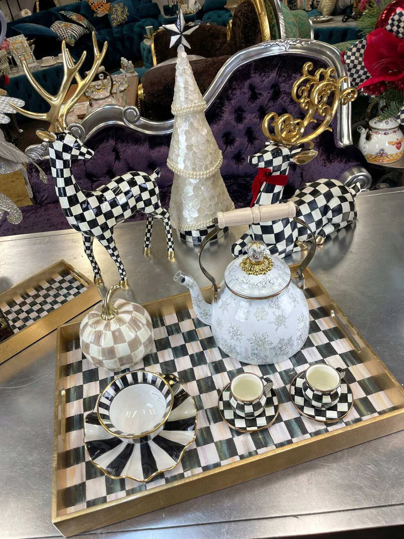 Suit your personali-tea with The Tea Kettle Collective. Embrace the wonder of winter with a warm cuppa served with the Winter Palace 2 Quart Tea Kettle. It features sparkling snowflakes on a heavy-gauge steel underbody, finished with a wood handle and a clear glass knob on the lid. Each special-edition Collective kettle makes a great cup of tea, of course, and adds MacKenzie-Childs style to your stovetop. Don’t be surprised that you need more than one.